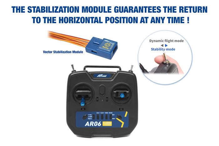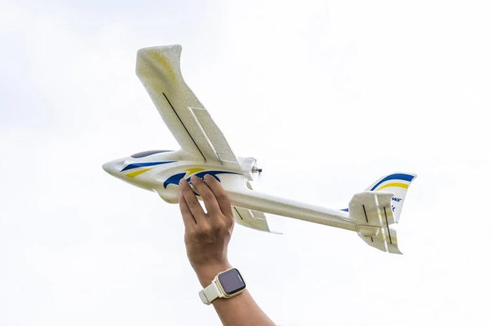 La construcción robusta de espuma EPP permite operaciones en campos difíciles: simplemente instale el ala en el fuselaje con las perillas de plástico, conecte la batería, deje que el giroscopio se calibre y vuele.