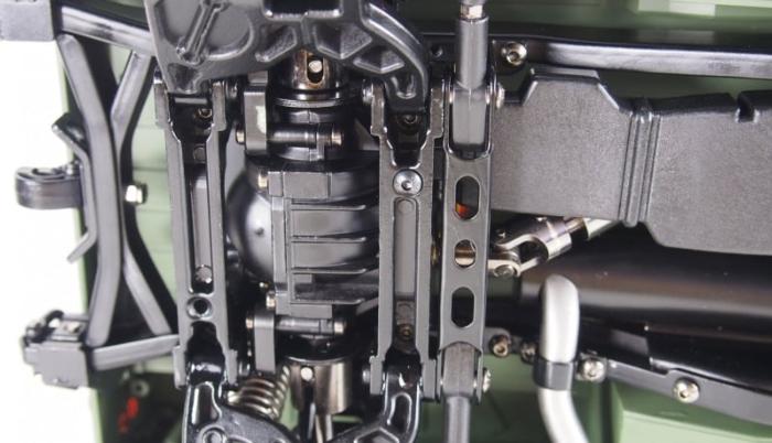 Una obra maestra técnica realizada parcialmente en metal como un maravilloso escalador con numerosos accesorios y numerosos detalles. Listo para funcionar (RTR) Este elegante vehículo a escala 1:10 establece nuevos estándares con una increíble atención al detalle y una gran tecnología. El modelo impresiona con un trabajo de pintura perfecto, una transmisión manual de 2 velocidades, un chasis totalmente protegido, electrónica impermeable y muchos accesorios opcionales como módulos de sonido o luz. Los ejes de portal y un chasis a escala con bajos completos a escala también forman parte del equipamiento de serie de este vehículo todoterreno. Todas las puertas se abren fácilmente desde el exterior y el interior está completamente equipado (incluso los asientos tienen una superficie de goma). El portón trasero cuenta con dos amortiguadores metálicos que lo mantienen abierto. El capó incluso está equipado con dos cerraduras metálicas laterales. Debajo hay un maniquí con motor a escala y el receptor con 16 canales. Desde el transmisor también se pueden controlar las siguientes funciones (también 16 canales): luz, sonido, humo, cabrestante, dirección (al convertir a dirección multieje), etc. También hay algunos canales libres si se quieren añadir más adelante uno o más accesorios opcionales. En el techo hay una trampilla con bisagras para el ametrallador.