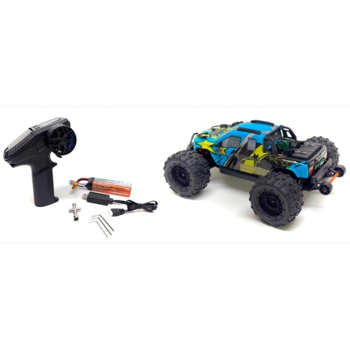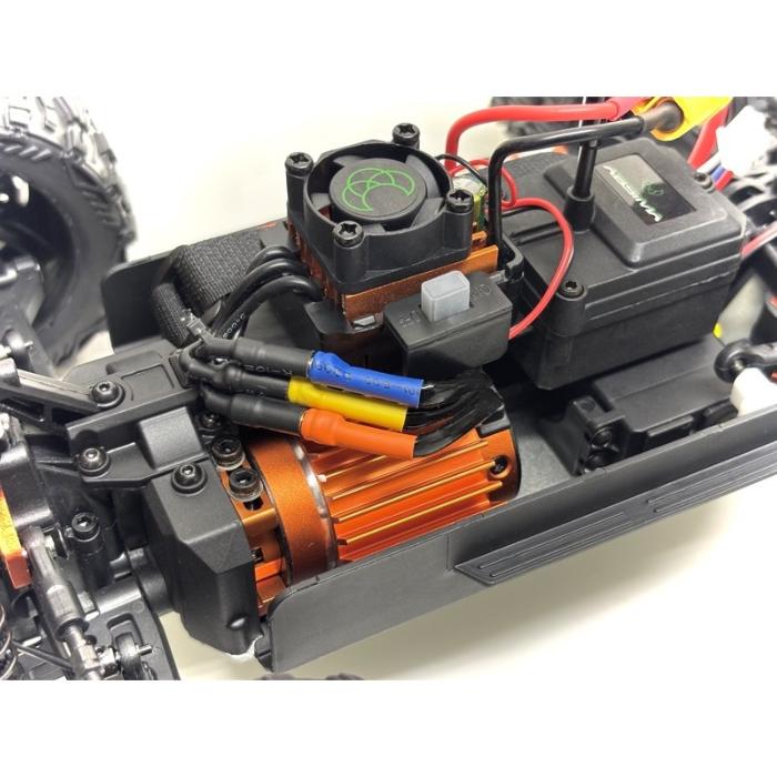 Este pequeño monstruo sin escobillas funciona con una batería de polímero de litio 3S y, por lo tanto, puede alcanzar una velocidad de +/- 70 km/h.