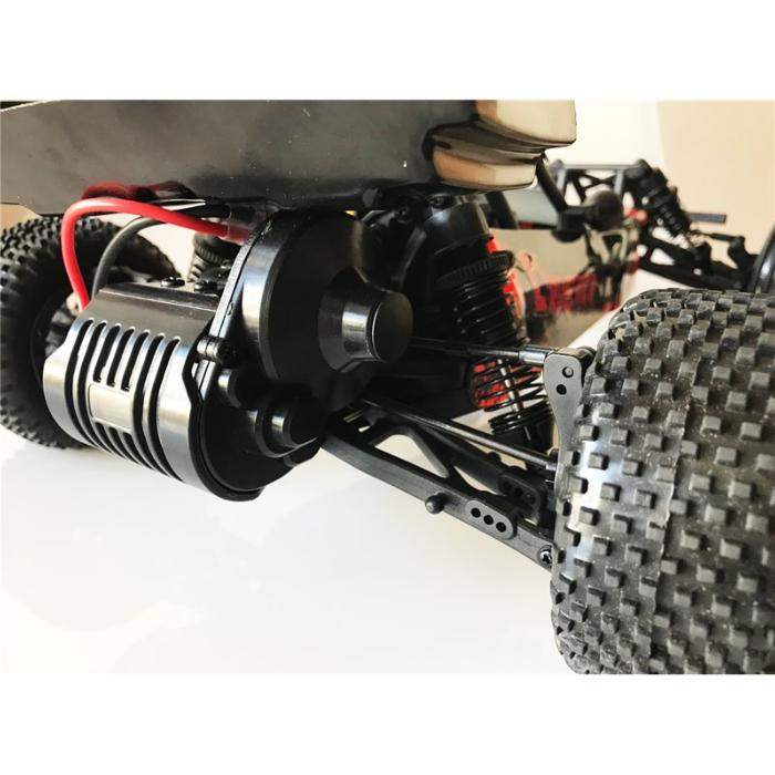 Cuenta con amortiguadores de aceite, varillas roscadas R/L, ejes de transmisión metálicos y una caja de cambios encapsulada.