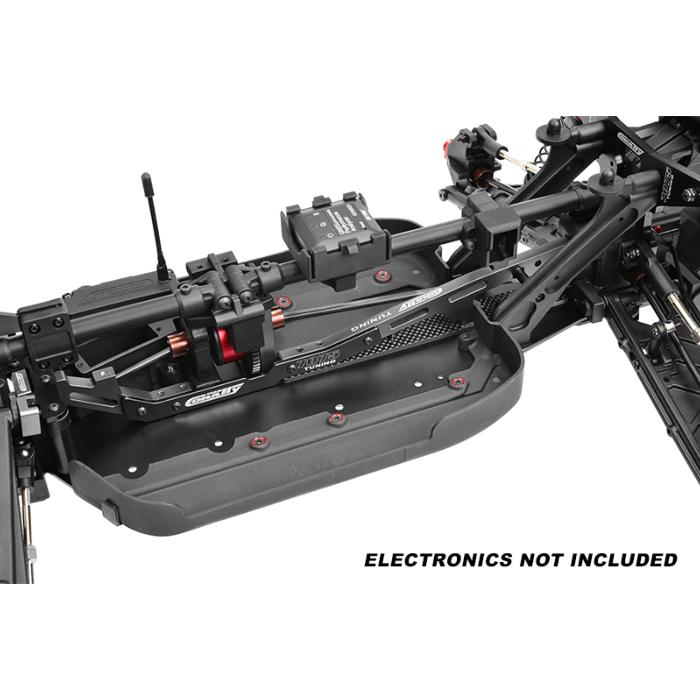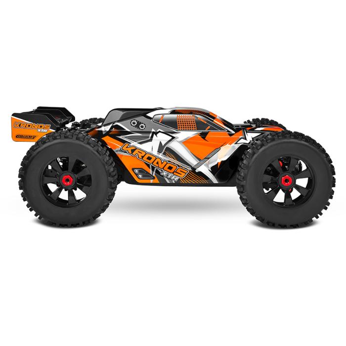 El KRONOS XTR también contiene nuevas rótulas de dirección ultra robustas, así como refuerzos extremos en aluminio de 3 mm de espesor para los ejes de suspensión. Debajo, las placas protectoras delanteras y traseras protegen el chasis durante acrobacias extremas. Un compartimento de batería extra grande facilita la instalación de su paquete LiPo favorito, y el sistema de dirección de doble placa de aluminio superresistente garantiza que el KRONOS XTR vaya exactamente donde lo apunte. Las barras de unión ajustables de acero para resortes de primera calidad permiten ajustar fácilmente la suspensión y la dirección, mientras que las duraderas llantas de competición compuestas y los neumáticos de goma de gran agarre garantizan la máxima tracción del vehículo.